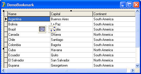 Рассмотрим небольшой пример, где право управлять закладками предоставлено пользователю (рис. 14.4). На форме, помимо других элементов управления (среди которых есть компонент TDBGrid), имеются две кнопки. Кнопка startBookmark помечает текущую запись, кнопка stopBookmark переходит к закладке, а затем уничтожает ее.